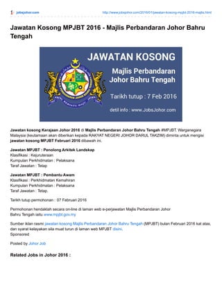 Rangka Kerja Kerjasama Komprehensif - Faizal Fredley. Jawatan Kosong Kerajaan dan Swasta 2016 menampilkan Jawatan Kosong Majlis Perbandaran Johor Bahru Tengah Disember 2016Jawatan ini melibatkan Majlis Perbandaran Johor Bahru Tengah MPJBT. Jawatan kosong johor Johor Bahru.