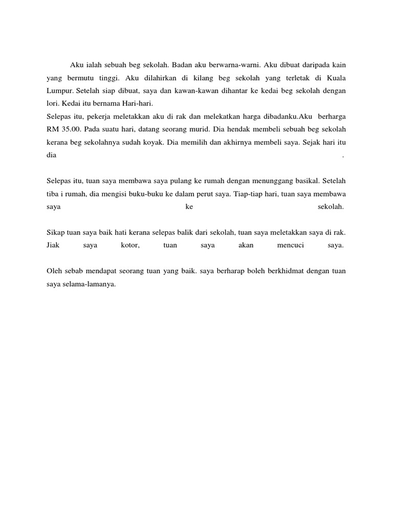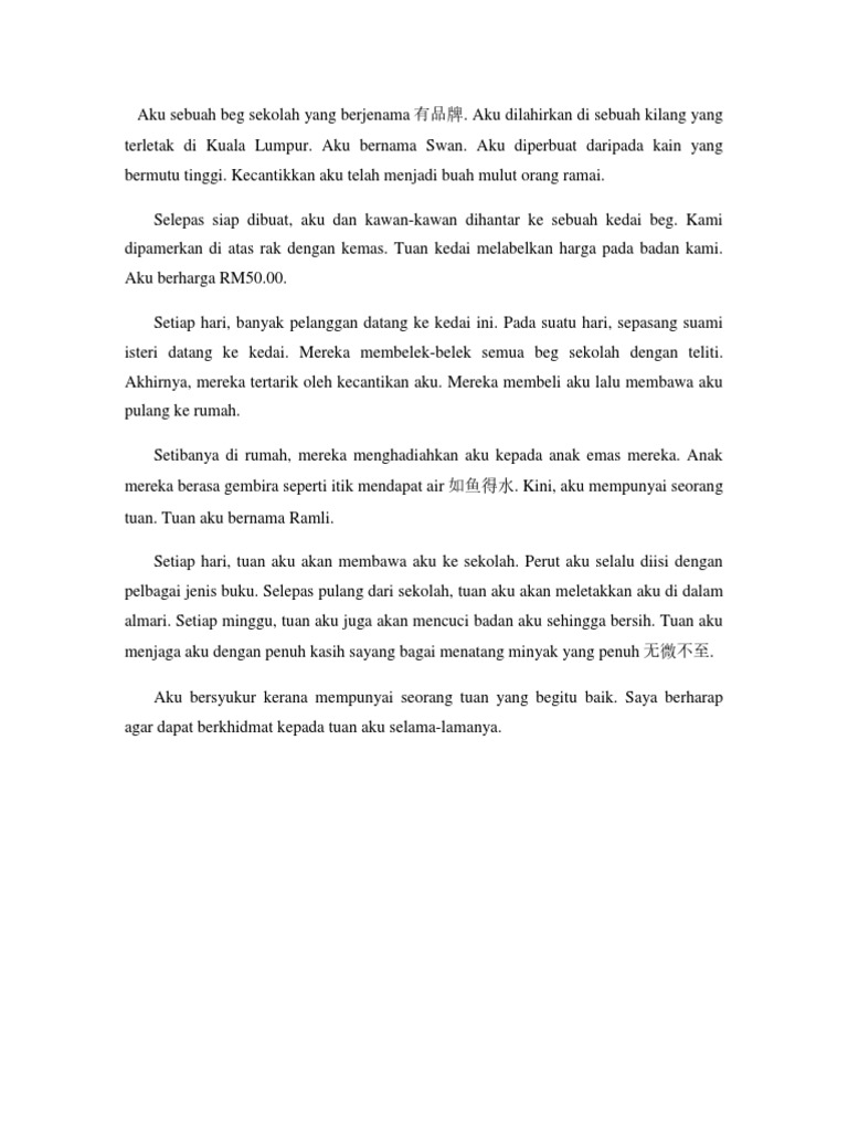 Aku sebuah beg sekolah yang berjenama有品牌. Aku dilahirkan di sebuah kilang yang terletak di johor bahru. Contoh karangan autobiografi aku sebuah beg sekolah contoh enem.